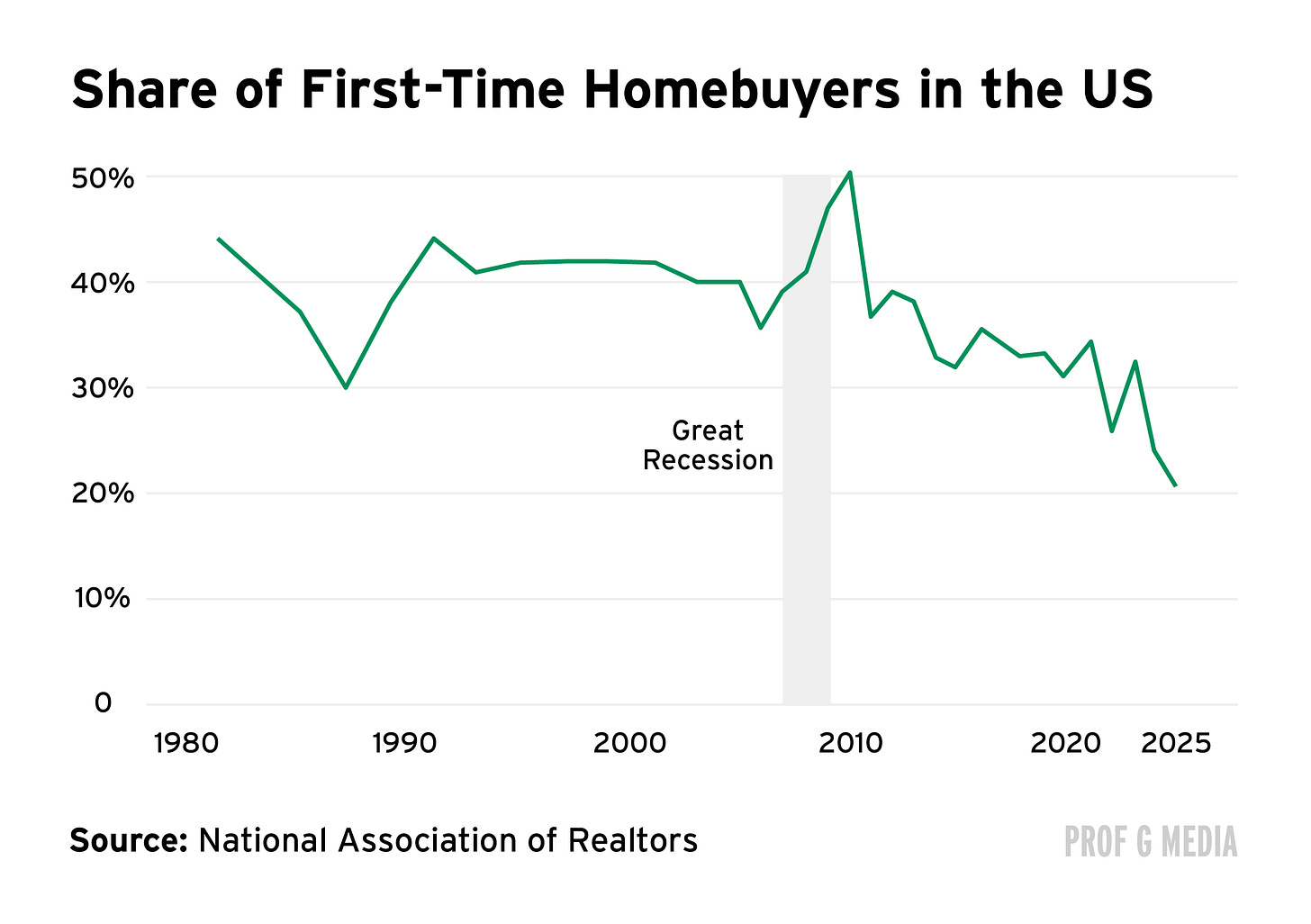 Young people have largely been shut out of the housing market, with first-time buyers now making up just 21% of all home purchases, down from roughly 40% throughout the 1990s.