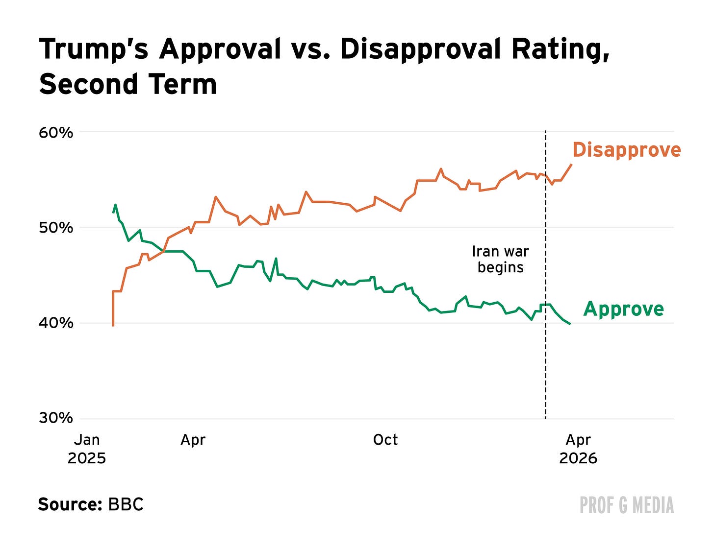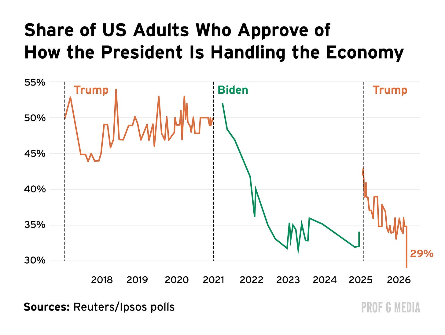 Consumer sentiment has only been worse 1% of the time in the series’ entire history. This is bad news for Trump, whose 29% approval rate on the economy is now lower than Biden’s worst scores during the post-COVID inflation spike.