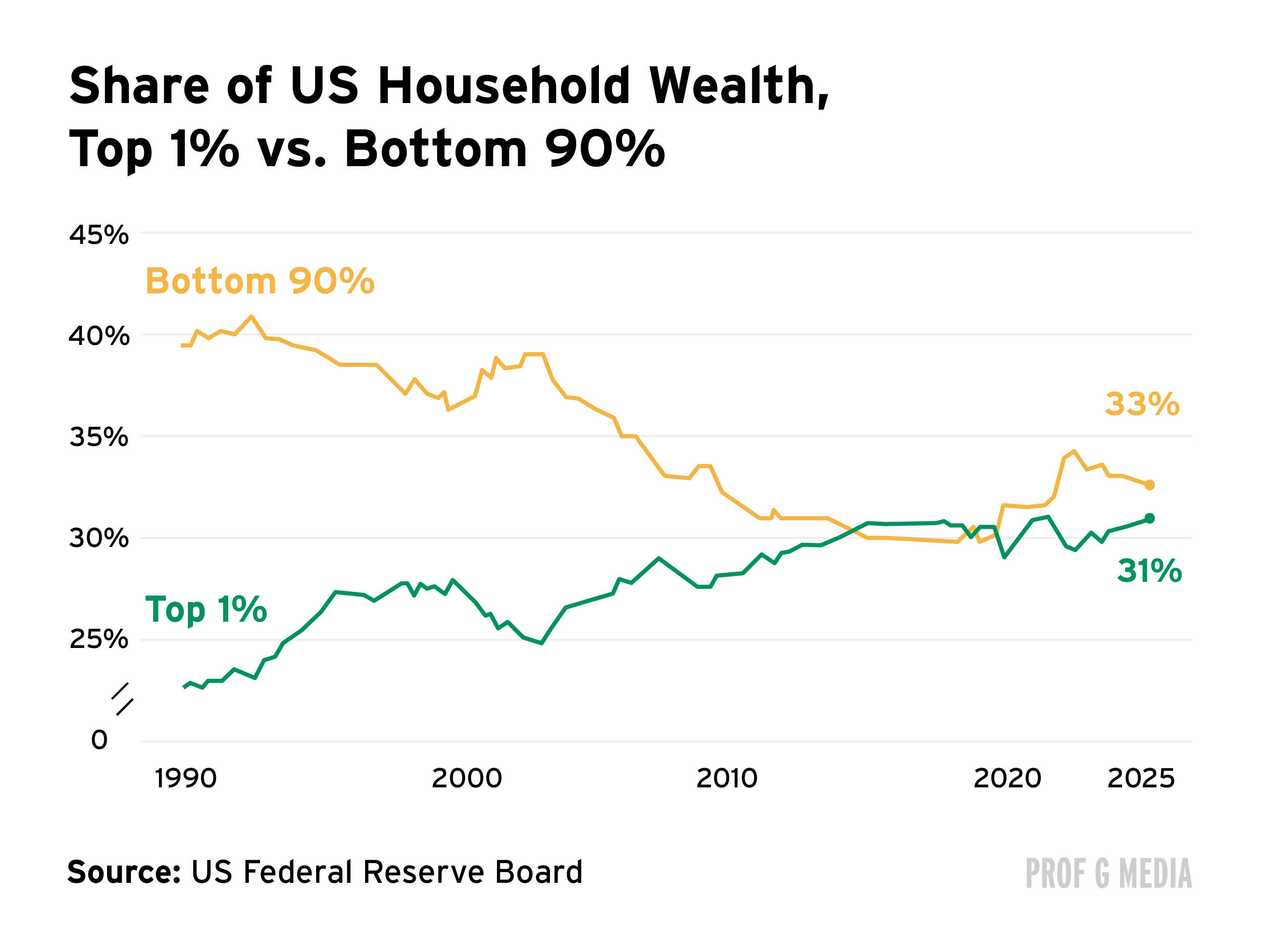 One of my favorite stats is the Gini coefficient. Zero means everyone has the same amount, 1 means one person owns everything. When France hit .83 in 1789, they started cutting people’s heads off. We’re at .85.