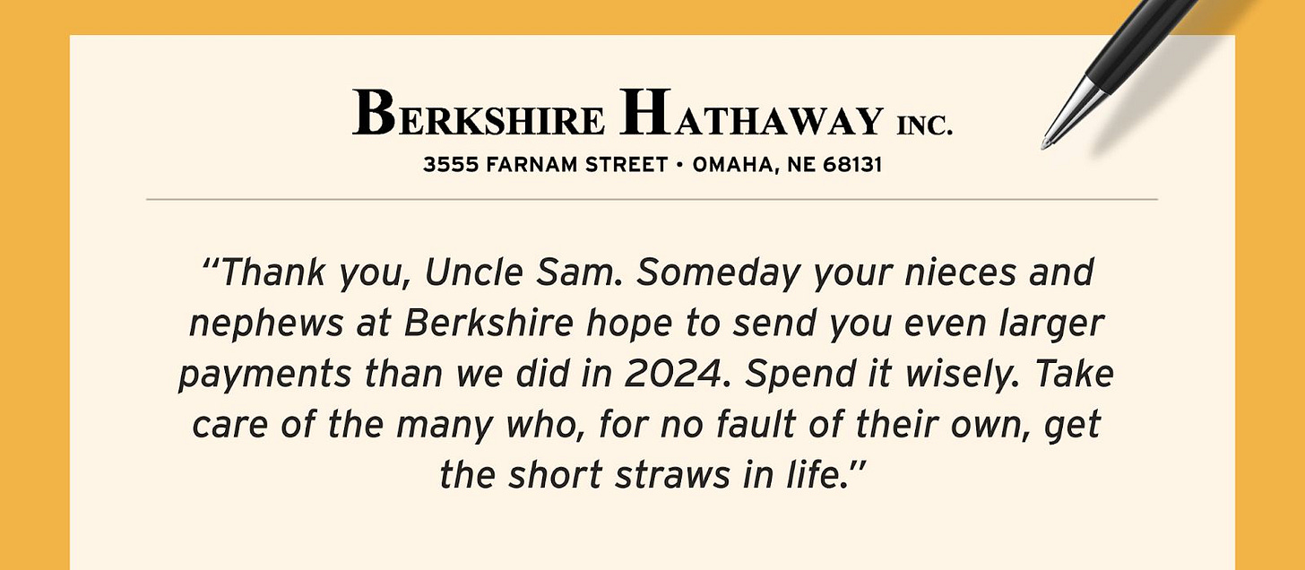 To illustrate the scale, Warren Buffett quipped that even if Berkshire had cut a $1 million check to the Treasury every 20 minutes last year, it would still owe a hefty sum.