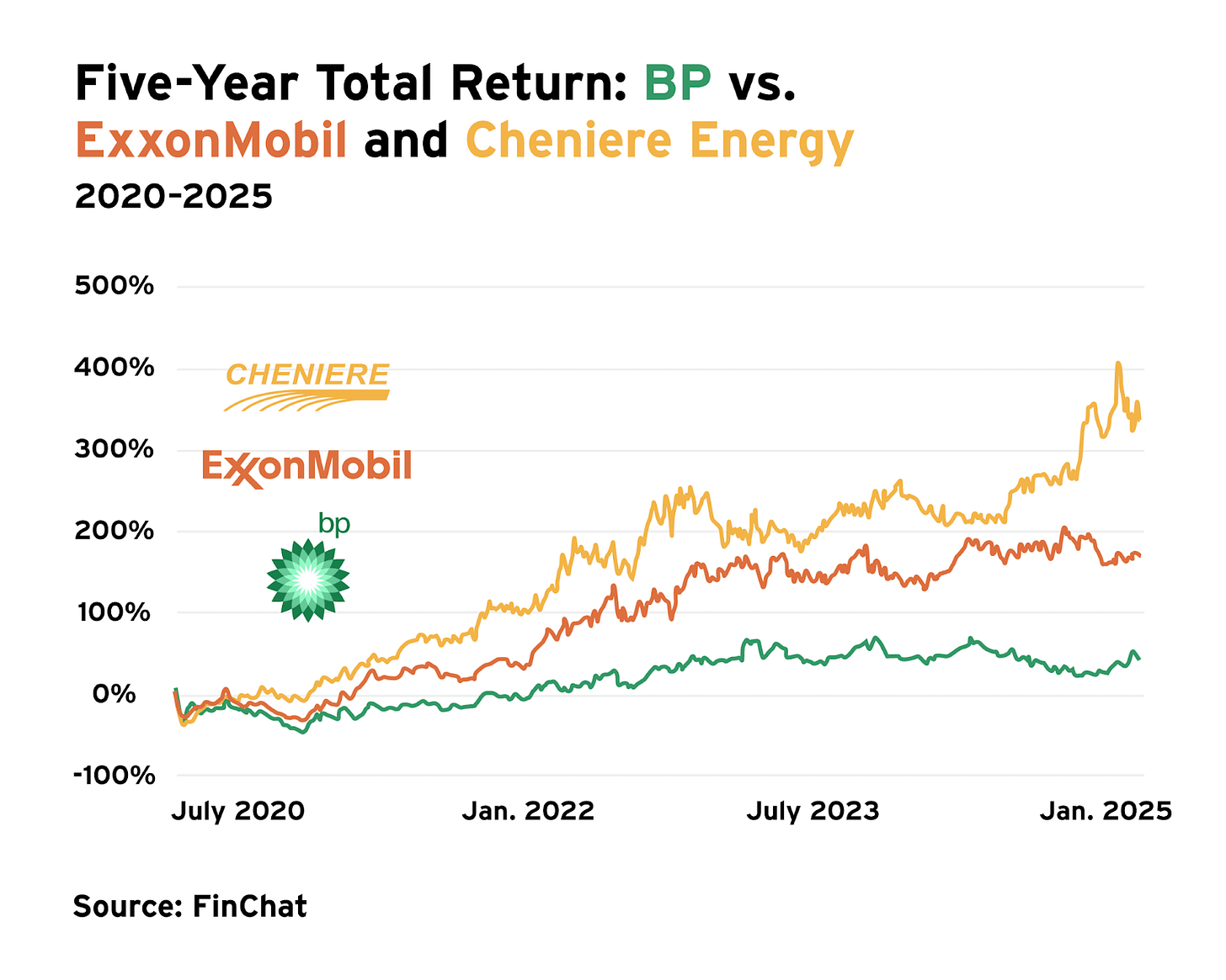 Markets never bought the ESG play: BP stock has underperformed, climbing just 43% in five years, while competitors like ExxonMobil (+172%) and Cheniere Energy (+348%) soared.