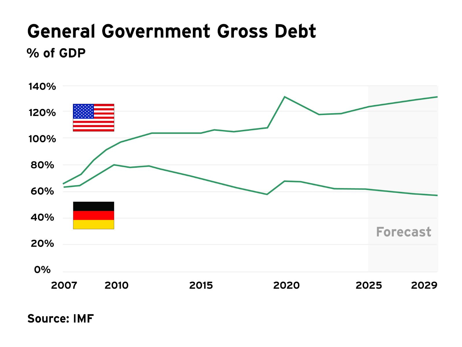 Germany’s debt-to-GDP ratio is 60%, the lowest in the G7 (compared with 100% in the U.K. and 120% in the U.S.).