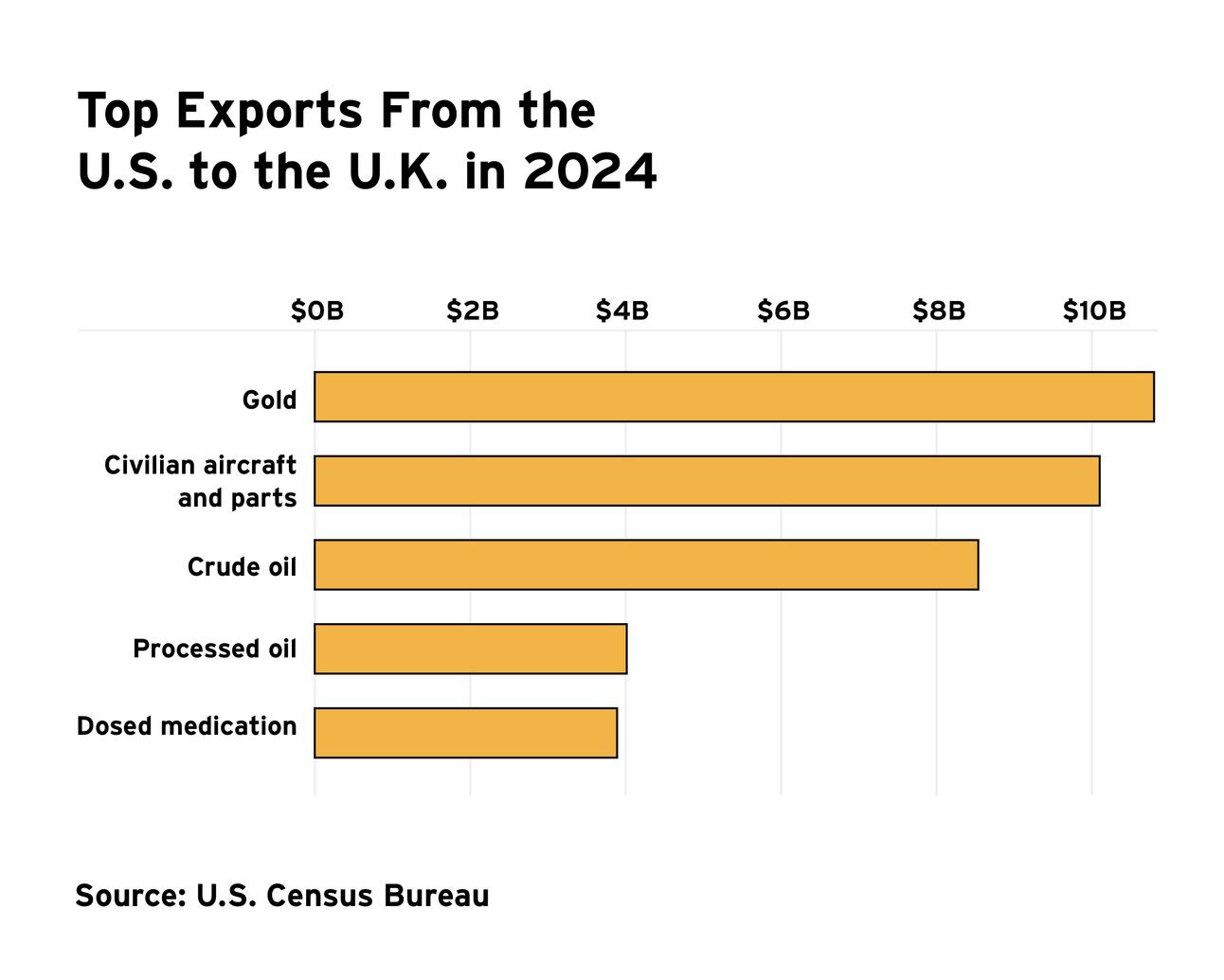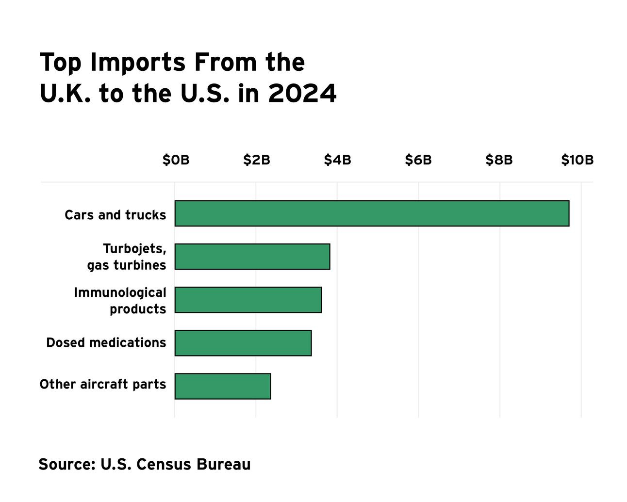 Autos: U.S. tariffs on U.K. car exports fell from 27.5% to 10% for 100,000 vehicles annually. (Britain sent 92,000 vehicles to the United States in 2024.)