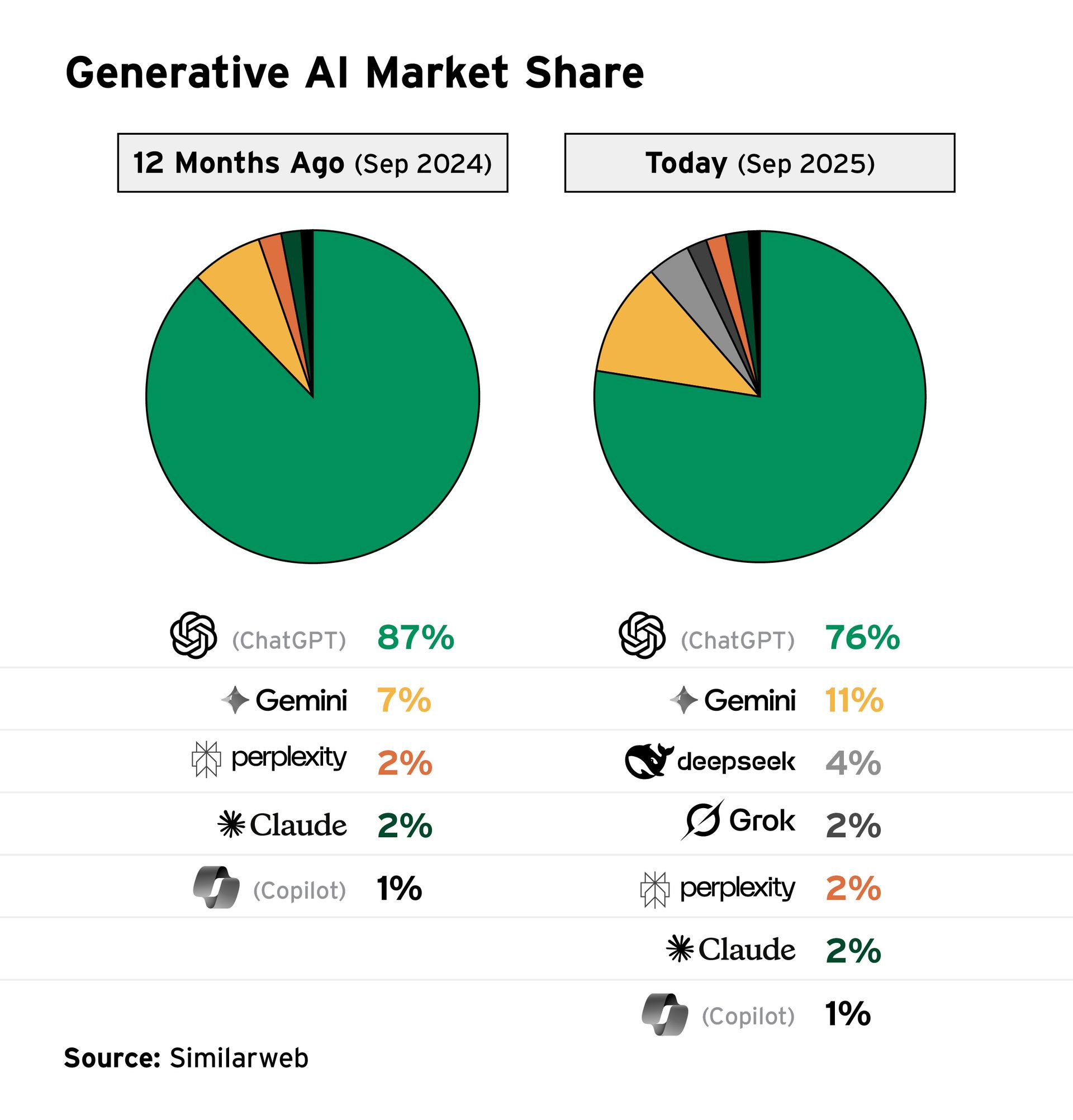 Meanwhile, Google’s Gemini has steadily gained share. Its new image generator, Nano-Banana, briefly pushed it past ChatGPT to the top of the App Store. But its real advantage lies in distribution. Google is already integrated into the lives of 90% of global internet users.