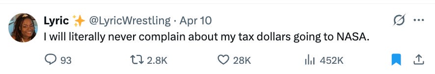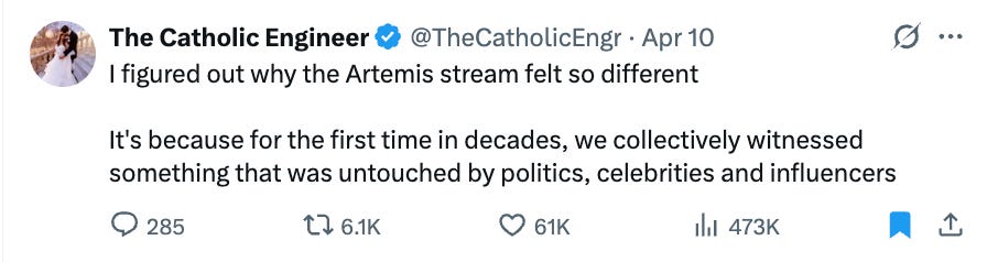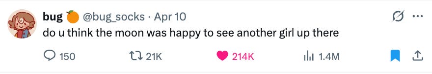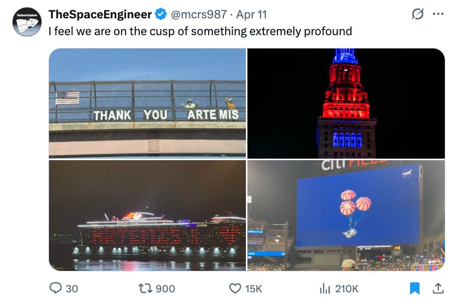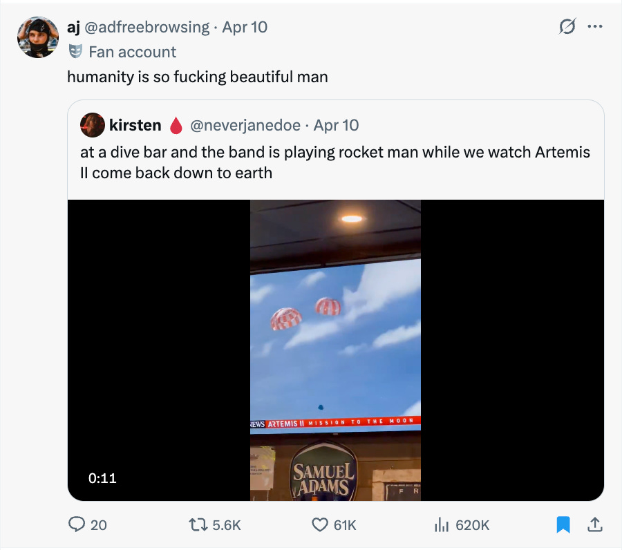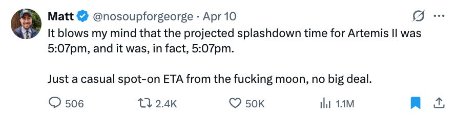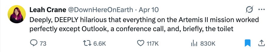 Instead of bonus reads this week, please enjoy a collection of the best X posts about Artemis II.