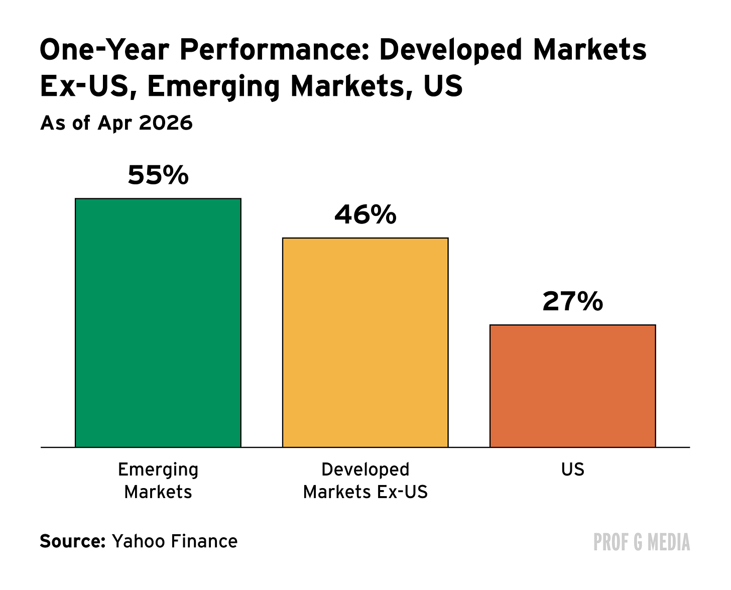 Now step back and look at a global portfolio. On a rolling one-year basis, developed markets ex-US are up 46%, emerging markets up 55%, and the U.S. is up 27%. The U.S. underperformance reflects political instability and uncertainty around Trump.