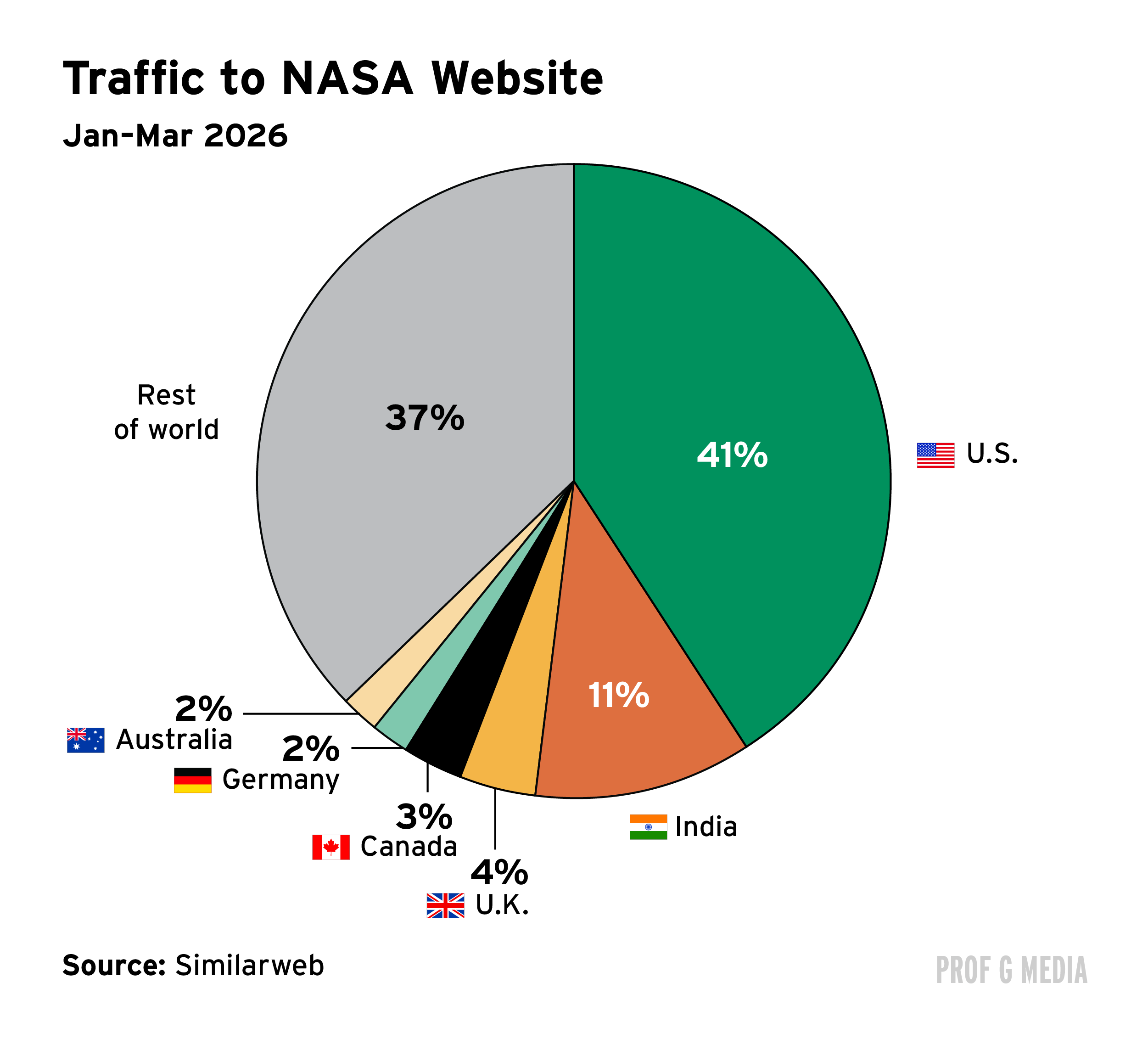 The NASA website gets more site visits than The Economist, twice as many as SpaceX, and almost as many as Tesla. Of all traffic, less than half is from the U.S.