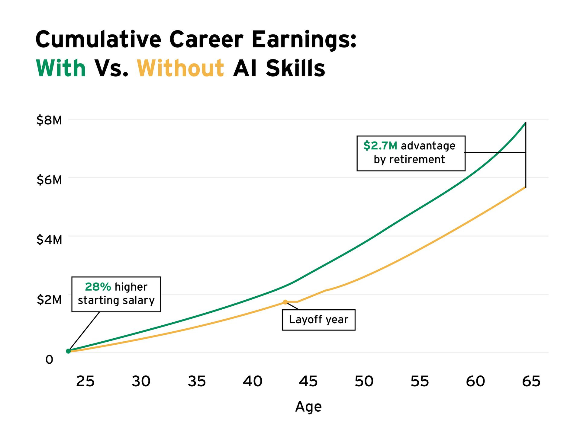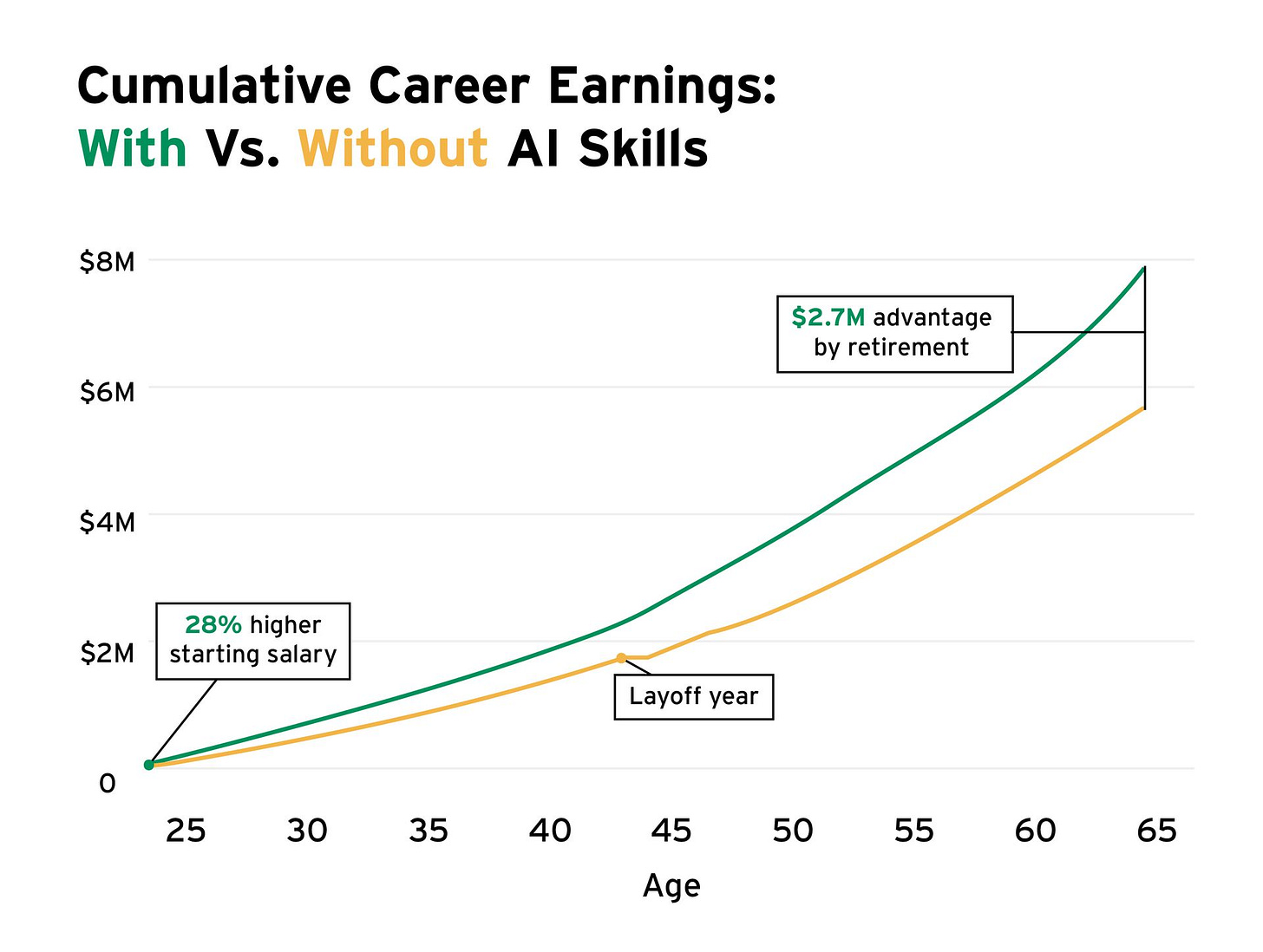 This is a multi-million-dollar opportunity. The benefits of having AI skills, or the consequences of not having them, will compound over the course of your career.