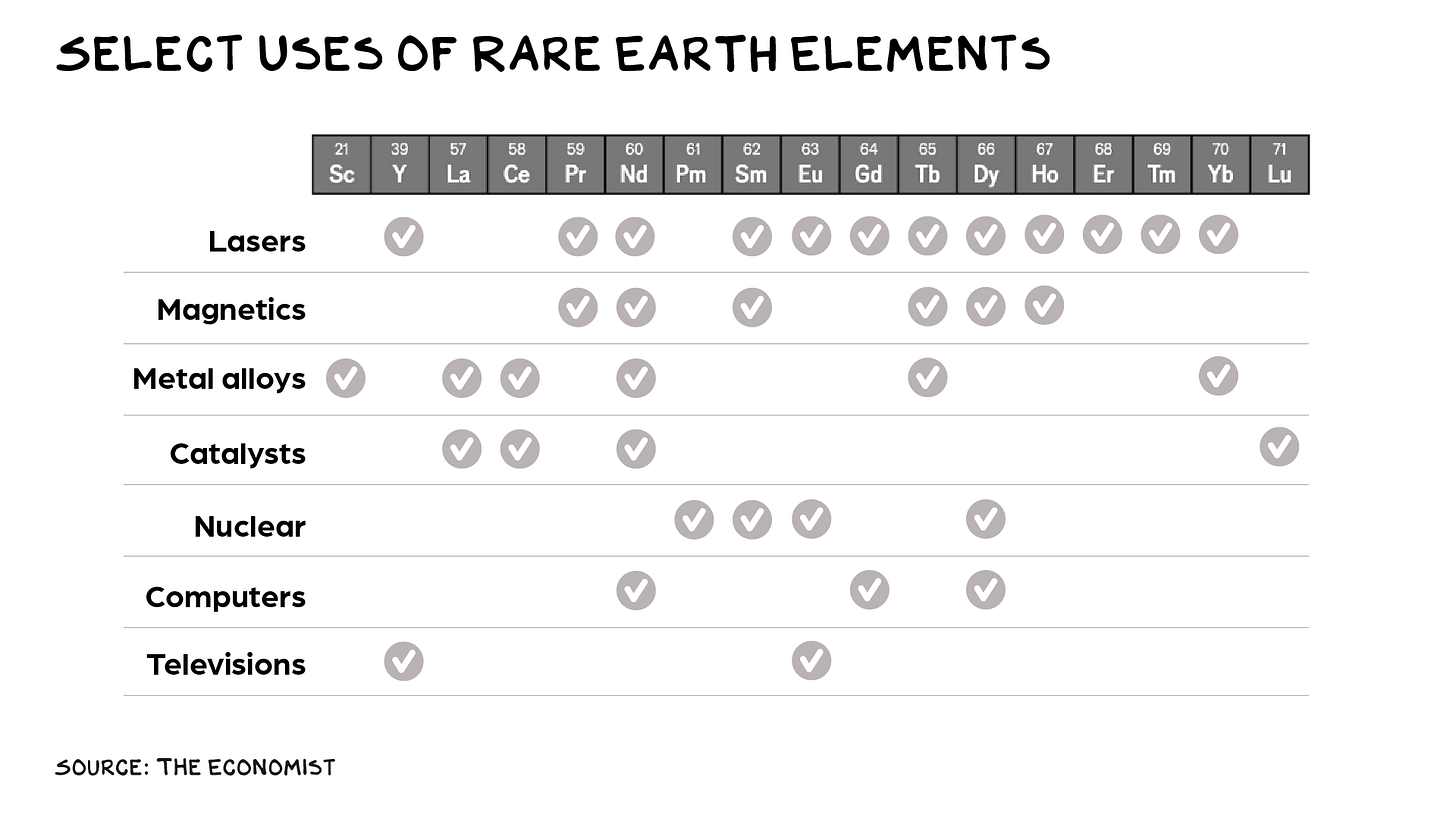 Rare earths is an umbrella term for 17 metallic elements. Despite the name, they aren’t especially rare, just difficult to extract and refine. Like petroleum, which is a raw input for more than 6,000 products, rare earths find their way into a wide range of modern technologies, including smart devices, solar panels, medical imaging equipment, and vehicles (both electric and internal combustion). Also, similar to petroleum, rare earths are vital to U.S. defense capabilities, from tanks and Tomahawk missiles to satellites. RAND estimates an F-35 fighter contains more than 900 pounds of rare earth materials in its engines and electronics. An Arleigh Burke–class destroyer requires approximately 5,200 pounds, and a Virginia–class submarine uses about 9,200 pounds. The question isn’t what do we need rare earths for, but what do we not need rare earths for? A: Nothing important.