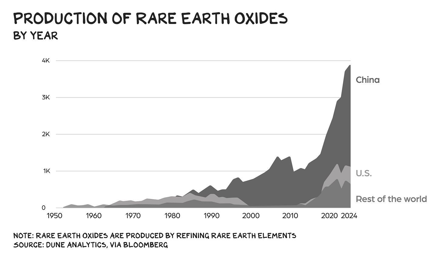 If rare earths are the new oil, China is the new OPEC. Chinese mines supply nearly 70% of the ore from which rare earth elements are extracted, and more than 90% of the refined materials. Meanwhile, the U.S. imports 70% of its rare earths from China. This asymmetry is a strategic vulnerability. According to a 2025 report from the Center on Strategic and International Studies, China has demonstrated a willingness to “weaponize” rare earths. In 2010, for example, China cut off rare earth exports to Japan over a maritime dispute, threatening to halt its automotive production. Japan responded by importing more rare earths from Australia in the short term and ramping up domestic production long term. Since then, Japanese rare earth imports from China have fallen from 90% to 60% — still too high, but low enough that Tokyo has options if Beijing restricts access. This week, China again banned the export of rare earths to Japan over its support for Taiwan, but, notably, the ban included a far broader category of goods, suggesting China’s rare earth leverage over Japan has weakened.