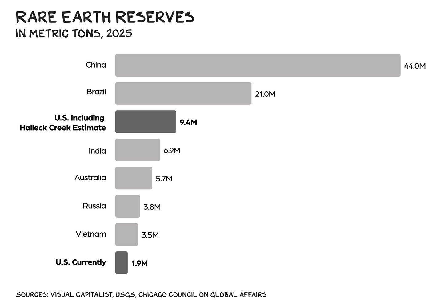 In 2024, reports out of Wyoming suggested that the U.S. had hit a rare earth mother load at Halleck Creek. Geo Hussar, an (outstanding) influencer who focuses on geopolitics, believes Halleck Creek, with an estimated 2.3 billion metric tons of ore, 50x China’s reserves, will eventually break Beijing’s stranglehold over rare earths. But according to Karl Friedhoff, a fellow at the Chicago Council on Global Affairs, Halleck Creek is likely to net closer to 7.5 million metric tons of usable rare earth material after extraction and processing. Even using the lower estimate, that’s enough to catapult the U.S. from seventh to third place, just behind Brazil. Still, the objective is getting rare earths out of the ground and into the supply chain. Unfortunately, it takes American mining firms an average of 29 years to go from discovery to operations, putting the U.S. next to last worldwide, just ahead of Zambia.