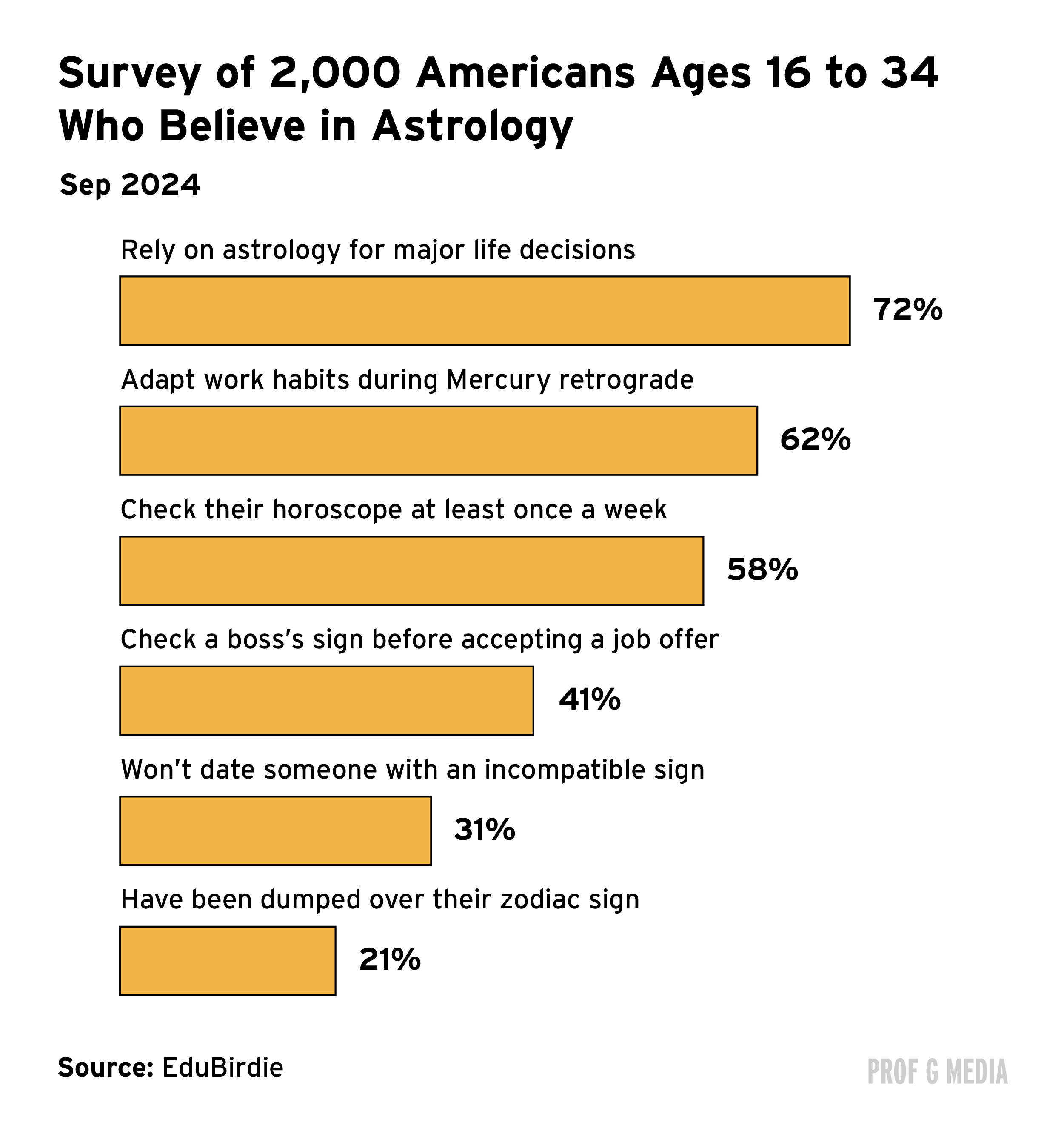 Astrophiles take their readings seriously: More than 70% of Gen Z and millennial believers use astrology to make major life decisions, and almost a third wouldn’t date someone with an incompatible horoscope.