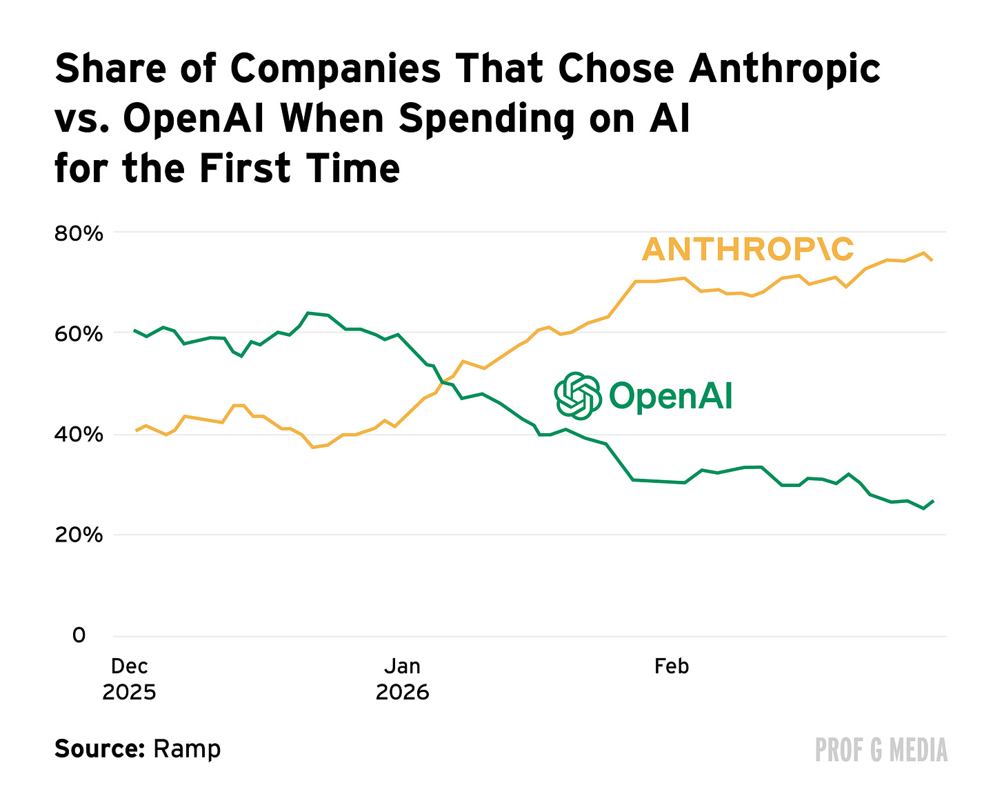 Anthropic’s lead in the B2B market has soared. It now captures over 70% of all spending among companies buying AI tools for the first time. As recently as December, OpenAI was capturing 60% of that spend.