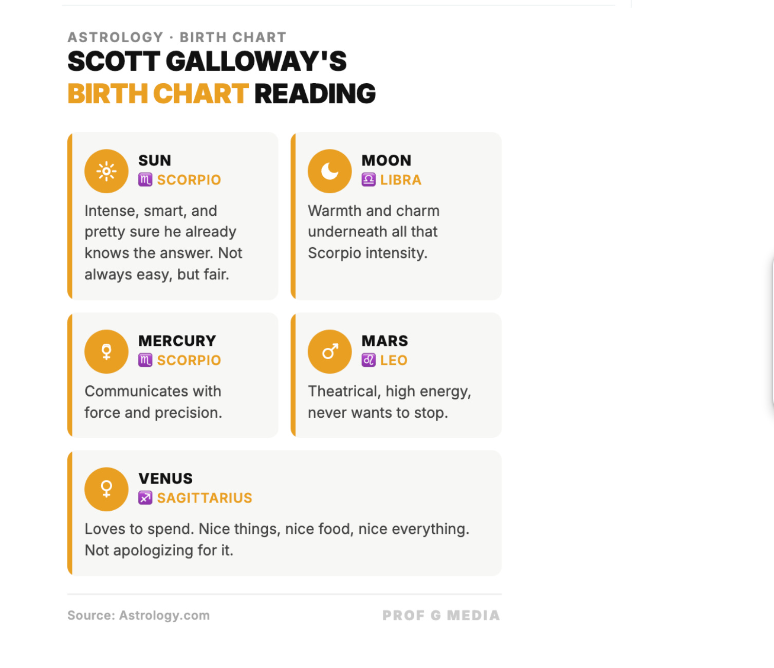 We make a lot of predictions at Prof G Media, but we have never gotten one from a professional. This week, we asked Carol — @astrostarr4 on TikTok — for her best markets prediction and birth chart reading for Prof G himself. If she’s right, we might just have to bring her in-house.