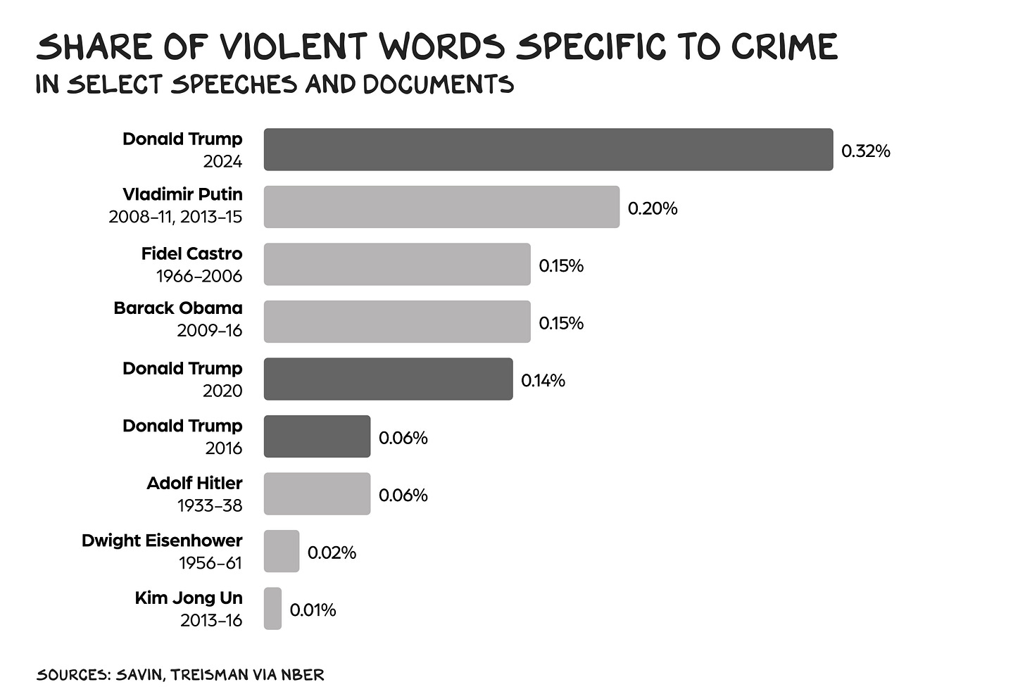 My intellectual sherpas these days are the historians Heather Cox Richardson and Timothy Synder. Whenever they’re on my podcast, I’m reminded history doesn’t repeat itself, but it rhymes. After reelecting an insurrectionist grifter, America doesn’t yet rhyme with the Third Reich, but the late-stage Weimar Republic. One alarming parallel: rhetoric that dehumanizes political opponents and out-groups. In his speeches, Hitler deployed “vermin” and “parasite” to fearmonger Germans into committing mass murder. Trump calls immigrants “garbage” from “shit-hole countries,” priming (some) Americans to want to throw out their neighbors. Meanwhile, the press is the “enemy of the people,” and dissenters are the “enemy within.” A National Bureau of Economic Research study found that the use of violent words in Trump’s speeches has trended upward since 2015, with an increasing focus on crime. “The growing violence of Trump’s language suggests a strategy aimed at spreading anxiety in order to boost demand for a strong leader who can combat the threats he invokes,” wrote the study’s authors, UCLA political science professors Nikita Savin and Daniel Treisman.