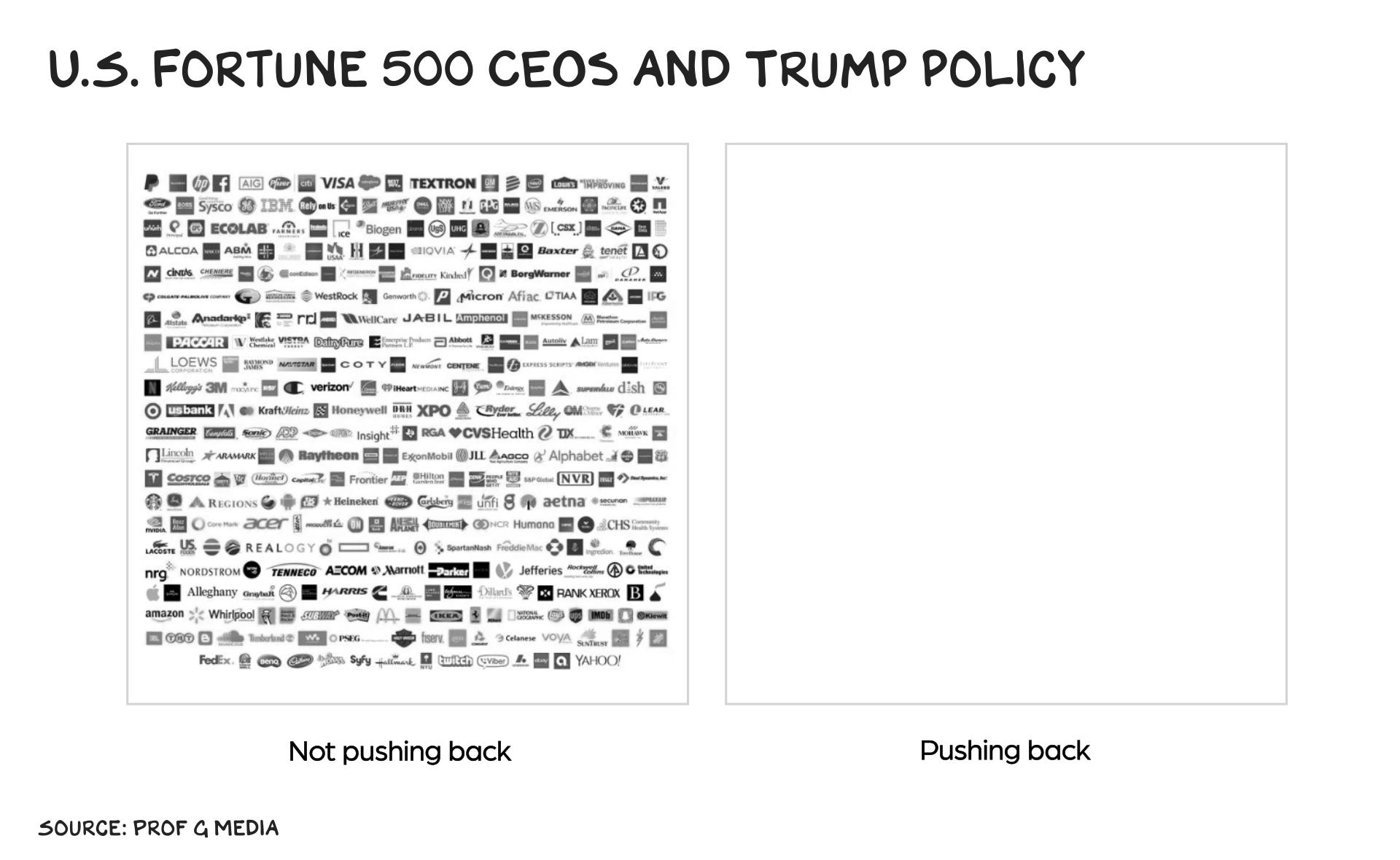 Another alarming parallel with Weimar Germany? Business leaders who provide cloud cover with their silence. German industrialists might’ve stopped Hitler but chose silence instead, as they wanted his help crushing labor unions. In public, Fortune 500 CEOs are silent about Trump. They prefer to wait him out, issuing watered-down press releases through trade groups only when absolutely necessary and bending the knee in exchange for tariff relief and favorable regulatory treatment. In other words, they’ve chosen the path of zero resistance, creating a speedway for an authoritarian.