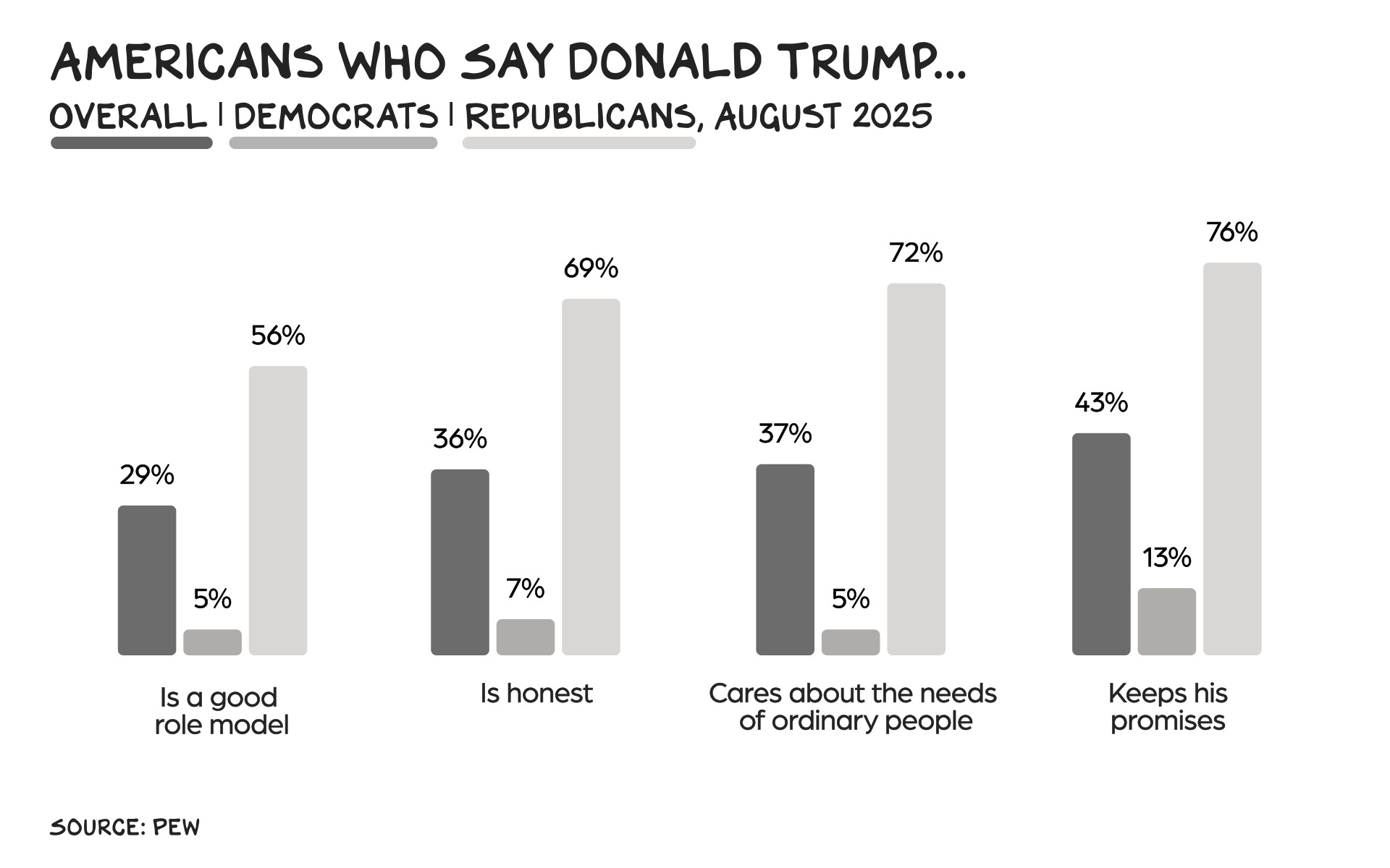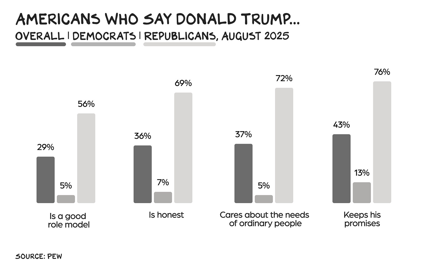 Trump’s performative concern over bad role models — won’t someone think of the children? — is rich from a man who appears in the Epstein files 38,000 times. More times than Jesus is mentioned in the Bible; more times than the word “meth” is uttered in all five seasons of Breaking Bad (#awesome). Trump’s depraved behavior is so omnipresent it’s been normalized. Worse, it’s become the cultural context for an entire generation of future civic, business and nonprofit leaders. Trump has been running for president or in office for a decade — if 2024 was the first election you were old enough to vote in, that’s more than half your life. According to a 2018 Quinnipiac poll, 90% of Americans believe it’s important for the president to be a good role model.