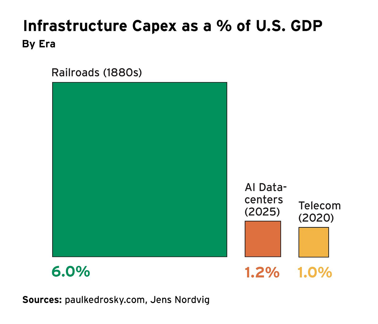 The AI boom has become an infrastructure boom. Case in point: Capital expenditures on AI data centers are already more than the peak in telecom spending during the dot-com bubble and the buildout of 5G networks as a percentage of GDP.