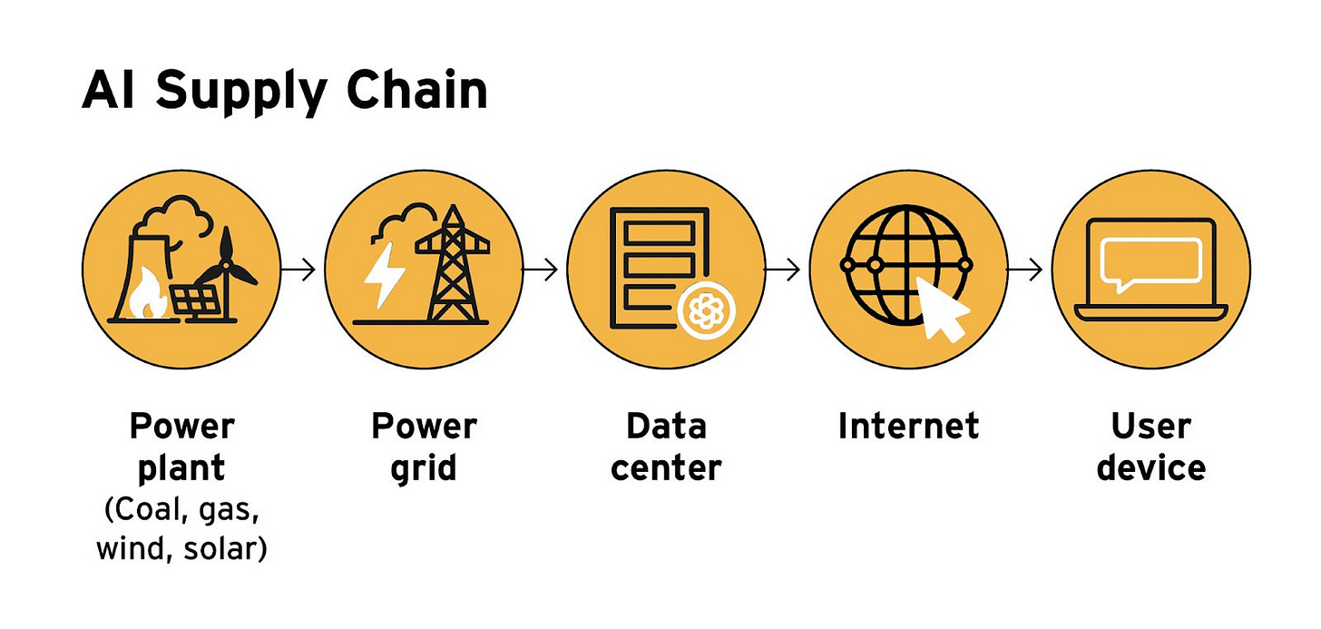 To understand what’s happening, start with where AI actually runs. Not on your phone or laptop, but inside massive data centers, packed with GPUs, cooled by industrial systems, and powered by electricity-intensive servers. These are the steel mills of the 21st century.