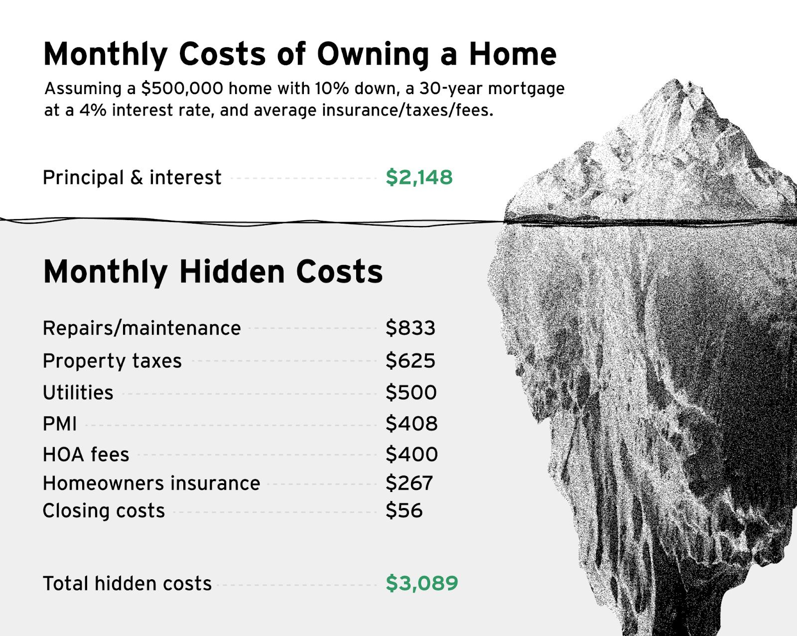 Maintenance and utilities: A common guideline is to budget 1%–4% of a home’s value per year for upkeep. Homeowners also spend more than $150 per month more on utilities than renters do.