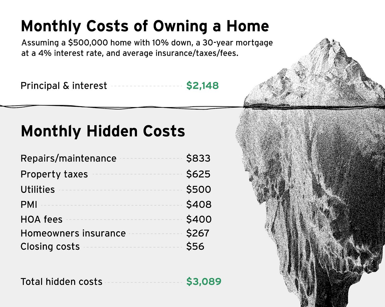 A helpful case study published by Business Insider illustrates this point: If instead of purchasing a $400,000 home, you instead invested the ~$41,000 down payment plus annual maintenance savings of $4,000 in the S&P 500, you could generate $1.8 million in profit over 30 years — nearly triple the $617,000 profit from home appreciation after accounting for all ownership costs.