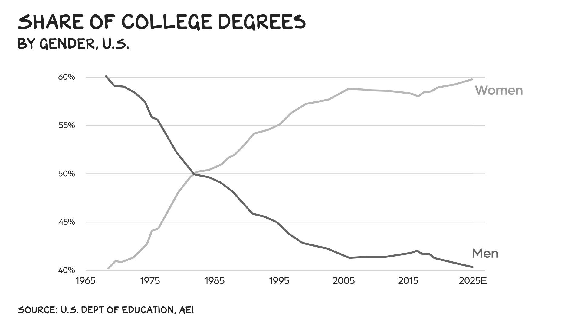 The challenges young men face are real. In school, boys fall behind their female peers and are much less likely to become valedictorians and go to college, with the education system biased against them and girls mature faster. American tax policy increasingly transfers money from the young to the old. We’ve adopted a scarcity mindset that only benefits incumbents — and the rising costs for housing and education that result take an especially heavy toll on young men, who are disproportionately evaluated on their economic prospects. Big Tech profits through sequestration and enragement, while digitizing dating has resulted in a winner-take-most environment.