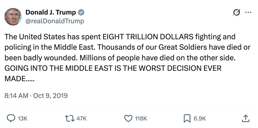 The great irony is that the guy going to war is the same guy who built his career on not going to war. Indeed, Trump’s contention wasn’t just that we shouldn’t go to war, but that we shouldn’t go to war in the Middle East. In 2016, he told us he was “totally against the war in Iraq,” calling it a “big, fat mistake.” He later repeated it was the “worst decision ever made.”