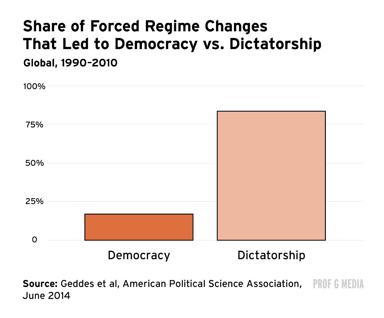 Have we been successful? The answer isn’t complicated: no. Out of the 28 regime changes we’ve been responsible for, only three have ever led to a lasting democracy. The rest have resulted in dictatorships and authoritarian regimes, many of which destabilized their regions ever further. By the way, this is a global trend: More than 80% of regime changes imposed by any nation have ultimately resulted in a dictatorship. In other words, the odds that regime change in Iran will lead to democracy are (significantly) worse than a coin flip.