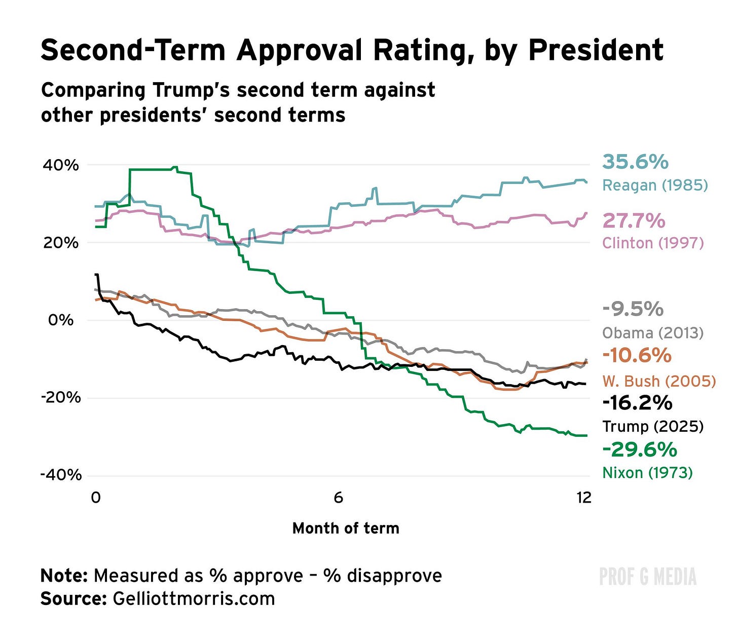 The American public isn’t happy. Trump currently has the worst approval rating of any second-term president in history except for Nixon. And among Gen Z, his net approval rating has dropped 42 points from where it was in February last year.