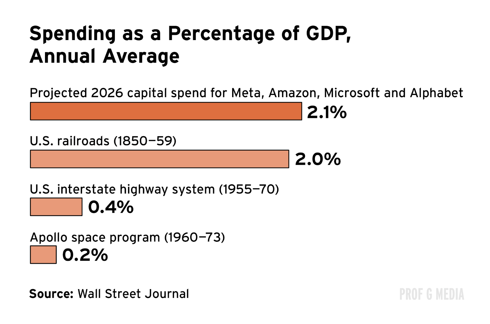 The arms race continues. Big Tech plans to spend $660 billion on AI this year. That’s five times more than America spent on the interstate highway system as a percentage of GDP. It’s also ten times what we spent on the Apollo Moon Program and the International Space Station combined. AI is fast on its way to becoming the largest project in the history of capitalism.
