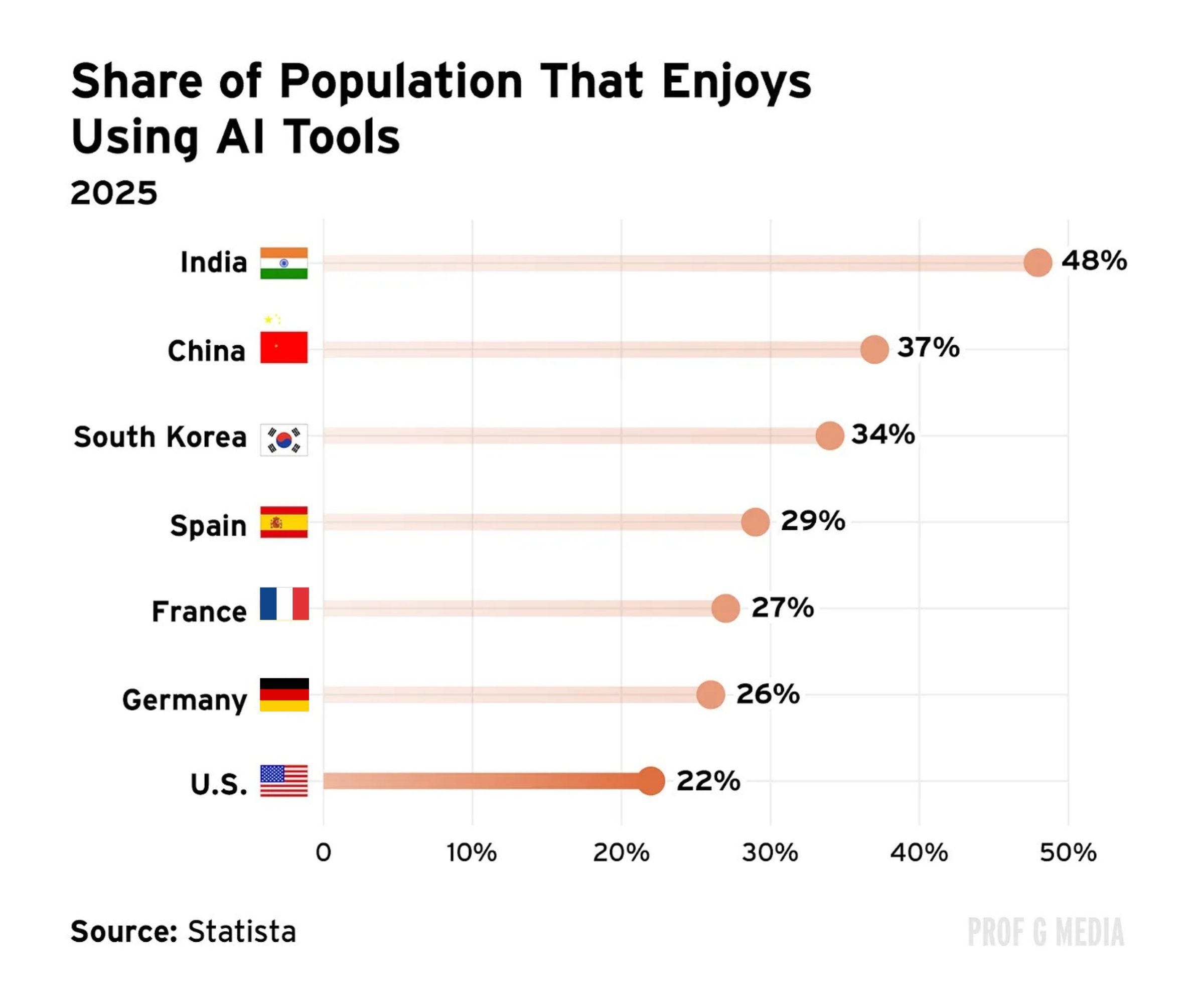 Here’s the data. Less than a third of Americans trust AI. Less than half of Americans have a favorable view of AI. Half of Americans say they’re more concerned about AI than excited (the highest in the world). Less than a quarter say they enjoy using AI (one of the lowest in the world). Three quarters of Americans think AI is going to reduce the overall number of jobs. More than half think it’s going to negatively affect our ability to do things on our own. 77% think it poses a “threat to humanity.”